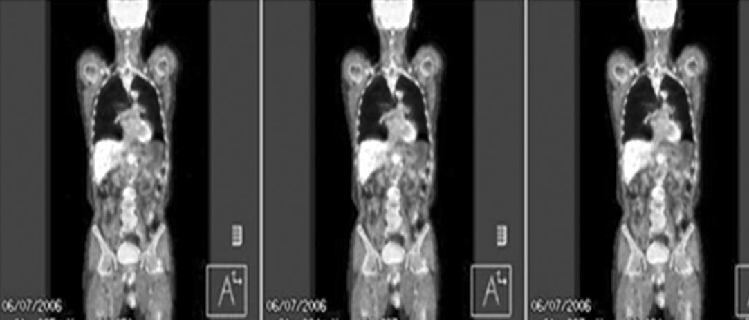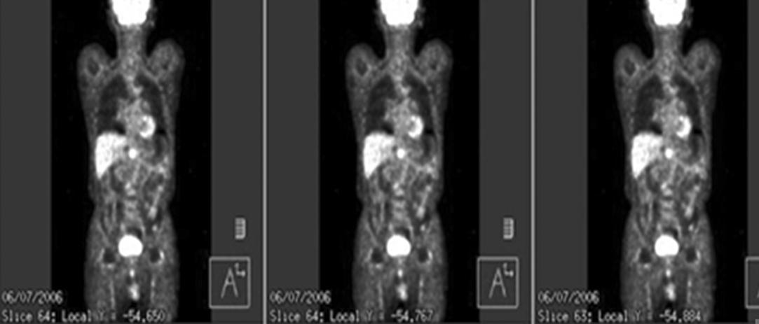 Fig. 3. 18F-fluorodeoxyglucose (FDG) PET/CT scan at 3.5 months after radiotherapy. The increased 18F-FDG uptake on the enlarged node was near completely disappeared.