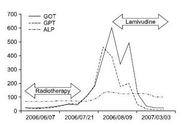 Fig. 2. Sequential changes of the liver enzyme levels. Aspartate aminotransferase (GOT) and alanine minotransferase (GPT) values were slowly increased during radiotherapy and then rapidly increased after radiotherapy. After diagnosis of hepatitis B virus reactivation, antiviral agent (lamivudine) was started and the levels were slowly normalized. ALP: alkaline phosphatase.