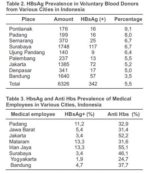 In Indonesia which has very large areas and consists of thousand of islands with many races and cultures, the endemicity varies greatly. Approximately 3.5% to 9.1% HBsAg prevalence was found in general population in Indonesia, with mean 5.1% (Tables 2 and 3). According to those data, epidemiologically Indonesia could be categorized as an intermediate to highly endemic country.8
