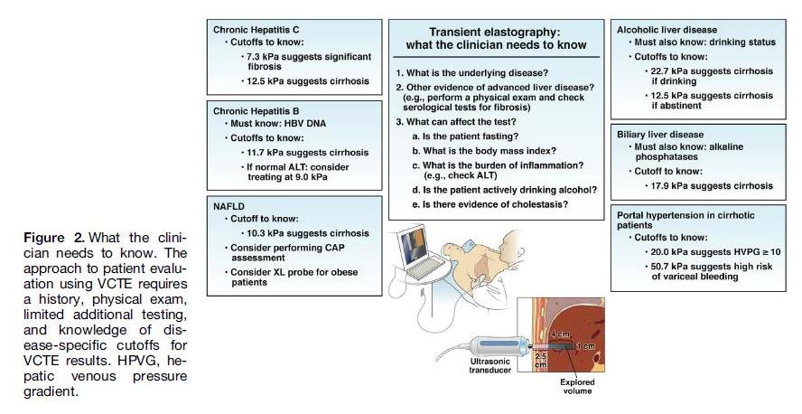 Chronic HCV infection is both common and an important determinant of public health in the United States. The morbidity of HCV infection is almost completely related to the development of cirrhosis. Because of the Centers for Disease Control’s recommendation to screen patients born between 1945 and 1965 for HCV and the rising tide of effective anti-HCV therapies, we should anticipate a major influx of patients on the order of 1 million who are seeking care for HCV.1 VCTE is an excellent option for these patients, potentially solving the cost and risk of biopsy assessment while lowering patient-related hesitation toward diagnostic testing. Accordingly, it is critical that clinicians are able to interpret VCTE results within the bounds of its limitations.