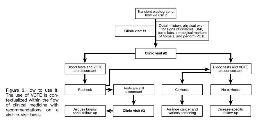 Judicious use of VCTE includes selecting appropriate candidates or at least acknowledging confounding factors. At a minimum, this involves knowing the patient’s underlying disease, BMI (obesity), ALT (inflammation), alkaline phosphatase (cholestasis), and whether they are fasting. Thereafter, we recommend that VCTE is performed in conjunction with an assessment of serologic markers of fibrosis such as Fibrotest, Hepascore, FIB4, or APRI.78,79 Concordant tests are considered mutually confirmatory, whereas discordant tests can be repeated at a later date and biopsies left only for patients in whom discordant results remain unresolved (Figure 3).