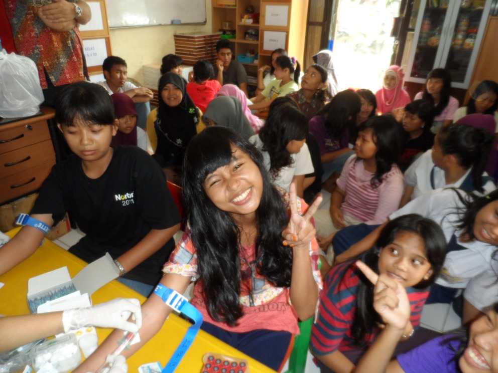 Persiapan dimulai oleh petugas lab, kemudian satu persatu anak-anak tersebut diambil darahnya. Yang lain sekali-kali melihat kemudian memberi semangat ketika temannya merasa kesakitan.