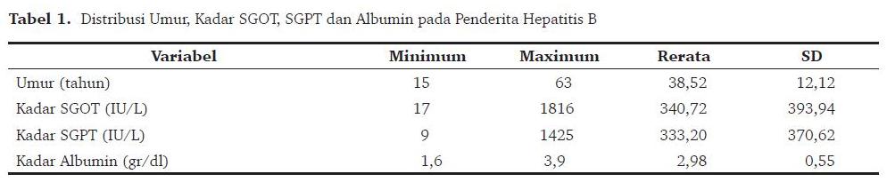 Sampel penelitian sebanyak 46 orang dengan pemerian (deskripsi) dasar sebagai berikut: umur antara 15–63 tahun dengan rerata 38,52 tahun, laki-laki 38 orang (82,6%) dan perempuan 8 orang (17,4%). Semuanya dengan tes HbsAg (+).