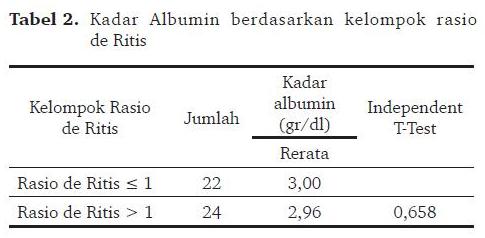 Terdapat 22 orang (47,8%) yang tergolong dalam kelompok rasio de Ritis ≤ 1 dengan rerata kadar albumin 3,00 gr/dl dan 24 orang (52,2%) yang tergolong di kelompok rasio de Ritis > 1 dengan rerata kadar albumin 2,96 gr/dl.