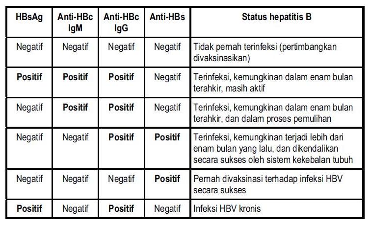 Tes darah yang dipakai untuk diagnosis infeksi HBV dapat membingungkan, karena ada berbagai kombinasi antigen dan antibodi yang berbeda, dan masing-masing kombinasi mempunyai artinya sendiri. Berikut adalah arti dari kombinasi yang mungkin terjadi: