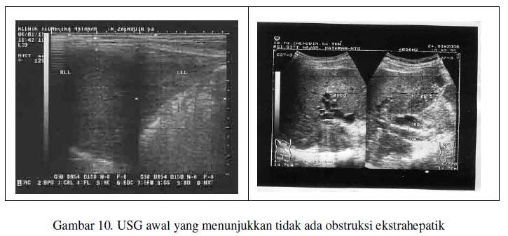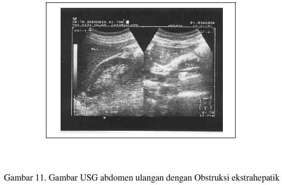 Karena hasil Patologi anatomi dari biopsi hati menunjukkan adanya kolestatik ekstrahepatik, maka dilakukan pemeriksaan USG abdomen ulang pada tanggal 24 Januari 2006 dan didapatkan Hepar : ukuran membesar ringan, permukaan rata, tepi tajam, echoparenkim baik, tak tampak nodul/abses. IHBD/CBD dilatasi sampai distal, tak tampak batu. Gall bladder tampak penuh dengan sludge. Pancreas kesan normal. Lien normal. Ren