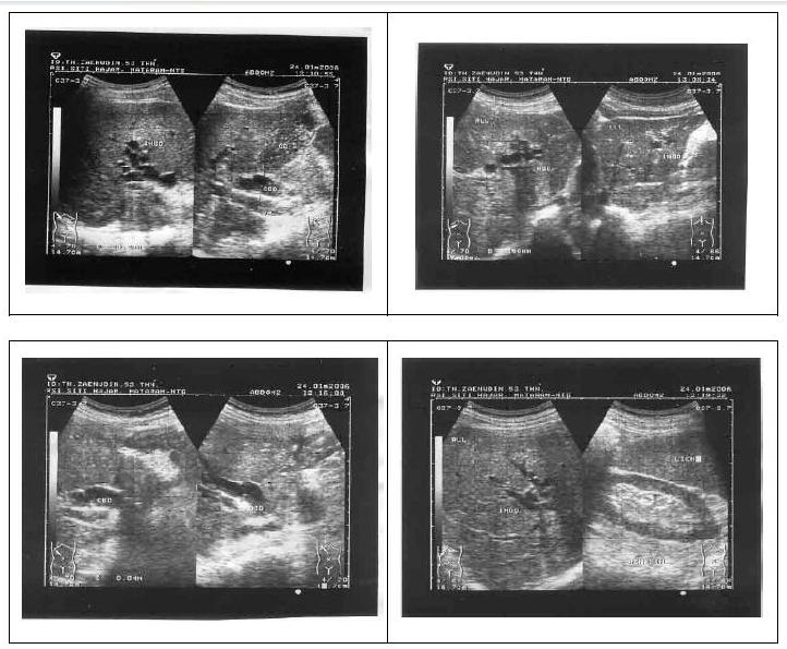 Hasil USG abdomen tanggal 12 Januari 2006 didapatkan Hepar : ukuran normal, intensitas echoprenkim homogen normal, tepi rata, sudut tajam, tak tampak pelebaran IHBD/EHBD, v. Hepatika/v.Porta tampak normal, tak tampak nodul/kista. Gall bladder : ukuran normal, dinding tidak menebal, duktus cystikus tampak normal, tak tampak pelebaran common bile duct. Pankreas/Lien : ukuran normal, intensitas echoparenkim homogen normal, tidak tampak nodul/kista. Ren D/S : ukuran normal, ukuran echocorteks homogen normal, batas sinus cortex jelas, tak tampak batu/nodul/kista. Kesimpulan : tidak tampak gambaran obstruksi common bileduct. Hasil USG disimpulkan adanya kolestasis intrahepatik yang belum diketahui penyebabnya maka kemudian dilakukan pemeriksaan PCR untuk mendeteksi virus Hepatitis E dan didapatkan hasil PCR Hepatitis E negatif. Pemeriksaan imunoserologi IgM anti HAV hasilnya negatif.