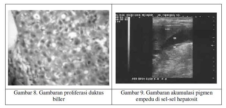 Jika terjadi obstruksi empedu, perubahan hepar dapat terjadi dengan cepat dan ikterus dapat terlihat dalam 36 jam. Setelah 2 minggu akan ditemukan ruptur dari duktus interlobuler. Pada kolangitis akan ditemukan lekosit polimorfonuklear pada kandung empedu dan sinusoid.2-9,11,18.