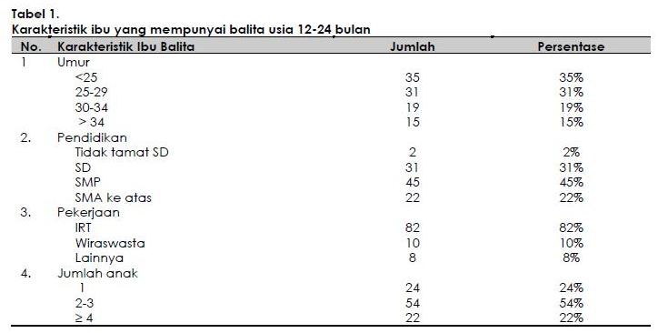Pada penelitian ini dilakukan wawancara terhadap 100 orang ibu yang mempunyai balita usia 12-24 bulan. Beberapa karakteristik ibu dapat dilihat pada Tabel 1.